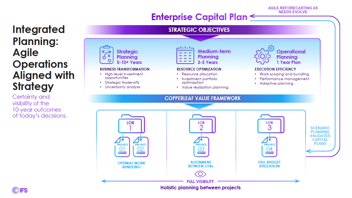 By adopting integrated planning with IFS Copperleaf, executives can ensure organizational strategy is executed effectively through chosen investments, driving long-term success and sustainability.