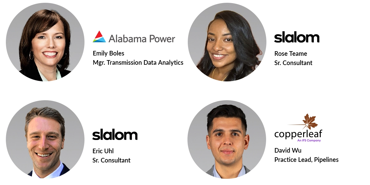 Join Santiago Vasquez, Practice Lead, Electrical Generation at Copperleaf, Emily Boles, Manager Transmission Data Analytics at Alabama Power, Rose Teame, Senior Consultant at Slalom, and Eric Uhl, Senior Consultant at Slalom to learn more about: