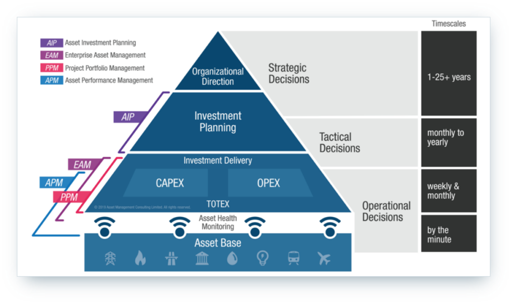 APM solutions “support the daily or weekly operational decisions and aim to improve the reliability of assets. AIP software instead enhances complex, longer-term tactical and strategic decisions relating to the CapEx/OpEx budget allocations and overall asset management planning. AIP systems leverage asset data (primarily sourced from APM and EAM systems) to predict the current and future performance of the asset base over a predefined horizon (usually over a year). The feasibility of each intervention option is determined using economic analysis, while each investment project as well as the overall plan is finally optimized around certain user-defined strategic inputs such as budget and regulatory (e.g. ISO 55000) constraints.”